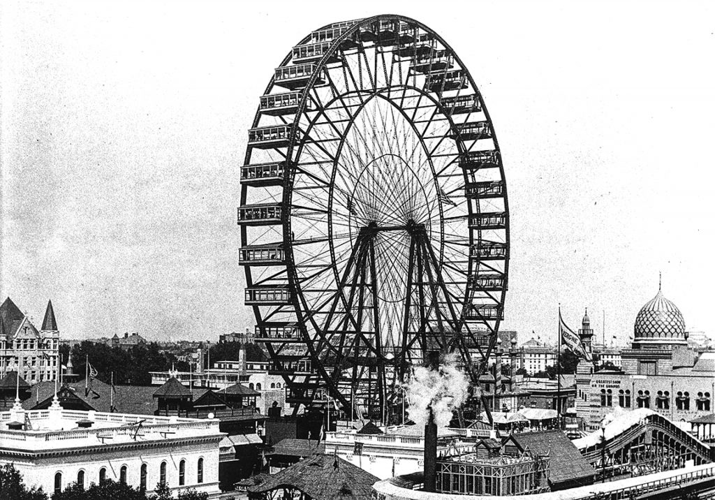 The term Ferris Wheel dates from George Washington Gale Ferris Jr.’s centerpiece for the 1893 World’s Columbian Exposition in Chicago. There had been smaller wooden amusements of this type for hundreds of years, but Ferris dreamt big and used steel and his 264-foot-tall wheel ended up also carrying his name forward into the present day.